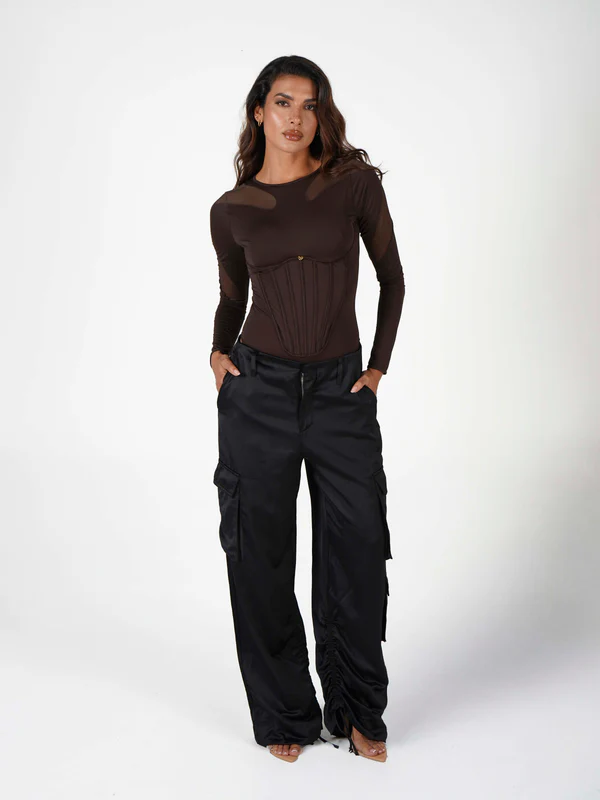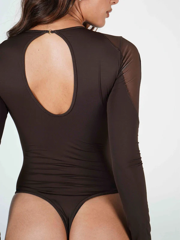 Body Anémona café confeccionado en licra y malla de alta calidad, cuenta con varillas en el abdomen que aportan estructura, sus transparencias en brazos y hombros le dan un toque de sensualidad sutil.
