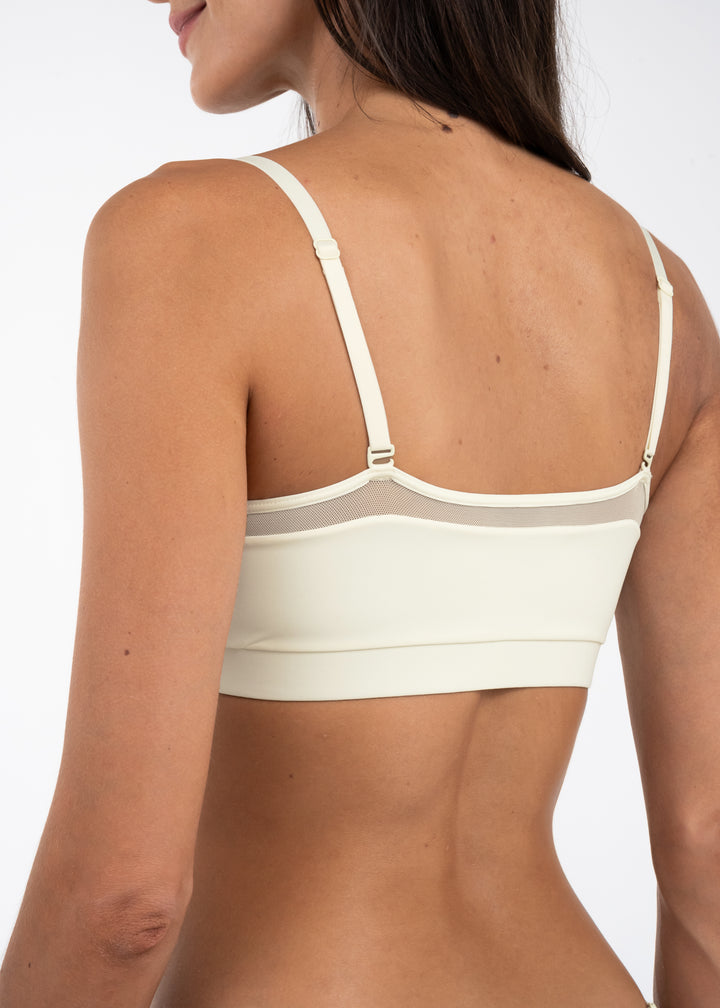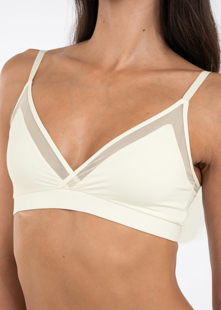 Top elaborado en tela suave y tul con copas triangulares sobrepuestas. Su contorno en espalda es ancho, por lo que brinda mayor cubrimiento en escote, sisa y espalda.