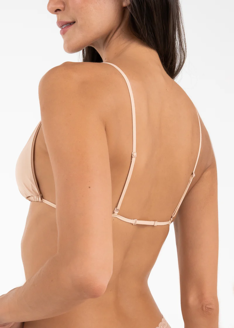 Top con copas tipo triángulo, copas internas removibles y tiras muy delgadas con diferentes ajustes, lo que hace que sea perfecto para blusas con escote. Es una prenda con soporte mediano.